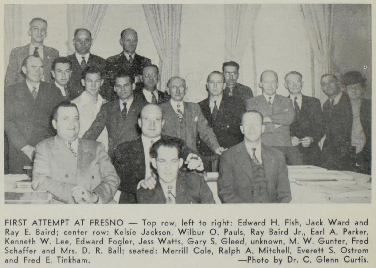 Of note, Fred E. Tinkham, attended the first meeting that led to the formation of the California State Numismatic Association (CSNA). This was described in the January 1957 issue of Calcoin News by the CSNA covering its founding and has a photo showing the group at the first attempt to create the a Califiornia state numismatic organization that became the CSNA. This article mentions that Fred E. Tinkham was present at the first attempt meeting in Fresno, CA with a photo taken by Dr. C. Glenn Curtis shown below.