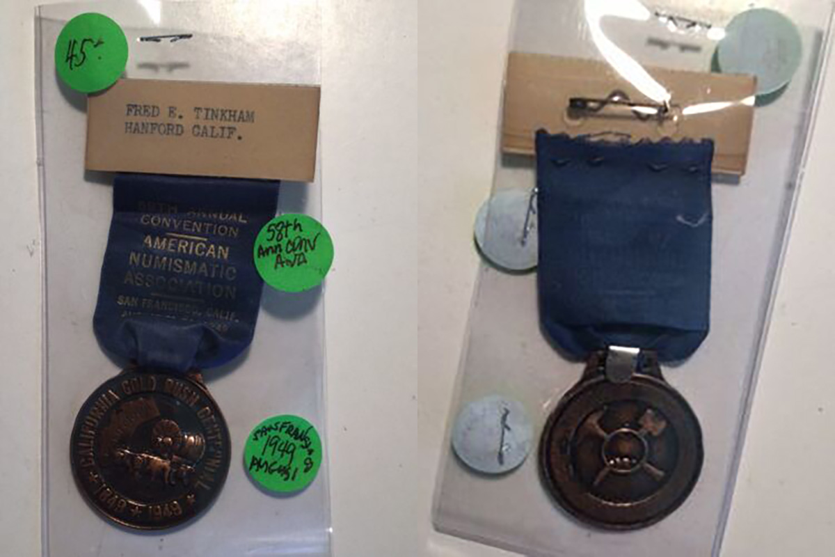 The following is the 1949 ANA Convention Badge for Fred E. Tinkham of Hanford, California. Of note, this is the only 1949 badge the author has seen with the name still attached.