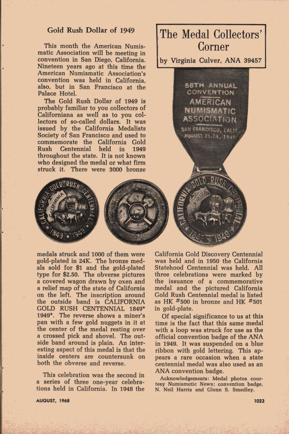 Virginia Culver, ANA member 39457, wrote an article on the medal which was published in the August 1968 issue of The Numismatist by the American Numismatic Association. The article includes photos of the medal and convention badge by N. Neil Harris and Glenn S. Smedley.