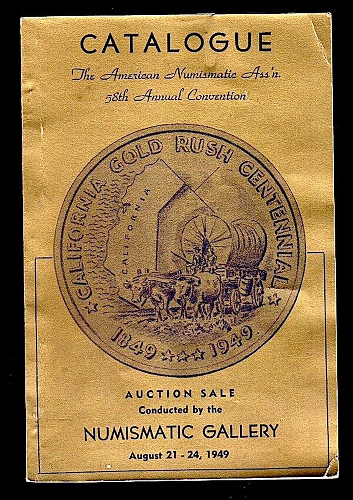 The Numismatic Gallery, owned by Abraham Kosoff and Abner Kreisberg, published their catalog for the August 1949 58th Annual American Numismatic Association Convention held in San Francisco, CA with an image of the HK-500/HK-501 So-Called Dollar on the cover. This medal was issued by the California Medalists Society and was looped for use as the 1949 ANA convention badge. This article showcases the cover of this catalog along with other material on the ANA convention baadge and the So-Called Dollar.
