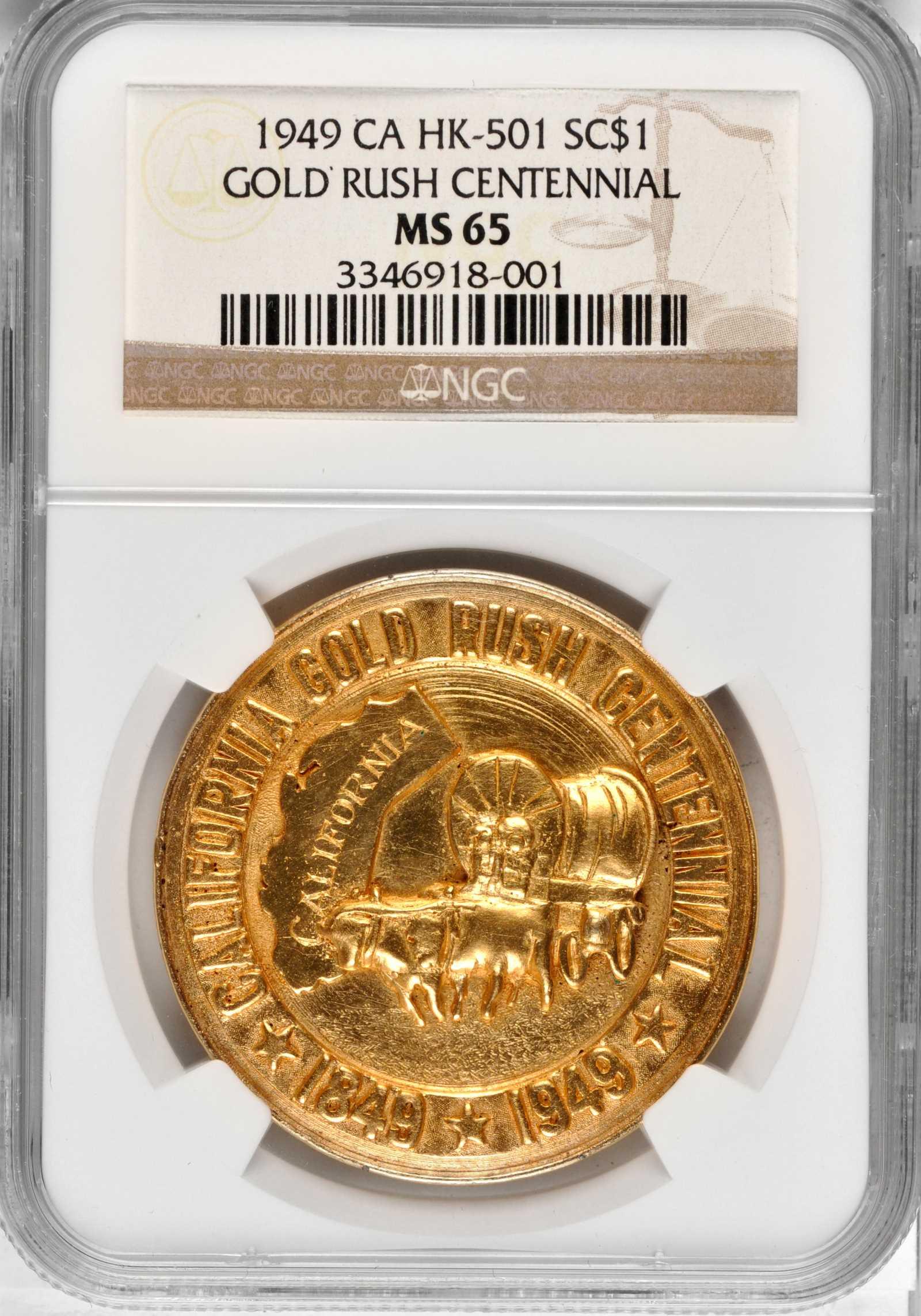 - Stack's Bowers Galleries. “1949 California Gold Rush Centennial. Gold Rush Dollar. Gilt Bronze. 39 mm. HK-501. Rarity-4. MS-65 (NGC)”. February 2015 Americana. February 2015. https://auctions.stacksbowers.com/lots/view/1-1IEPV/1949-california-gold-rush-centennial-gold-rush-dollar-gilt-bronze-39-mm-hk-501-rarity-4-ms-65-ngc. Accessed August 1, 2023.