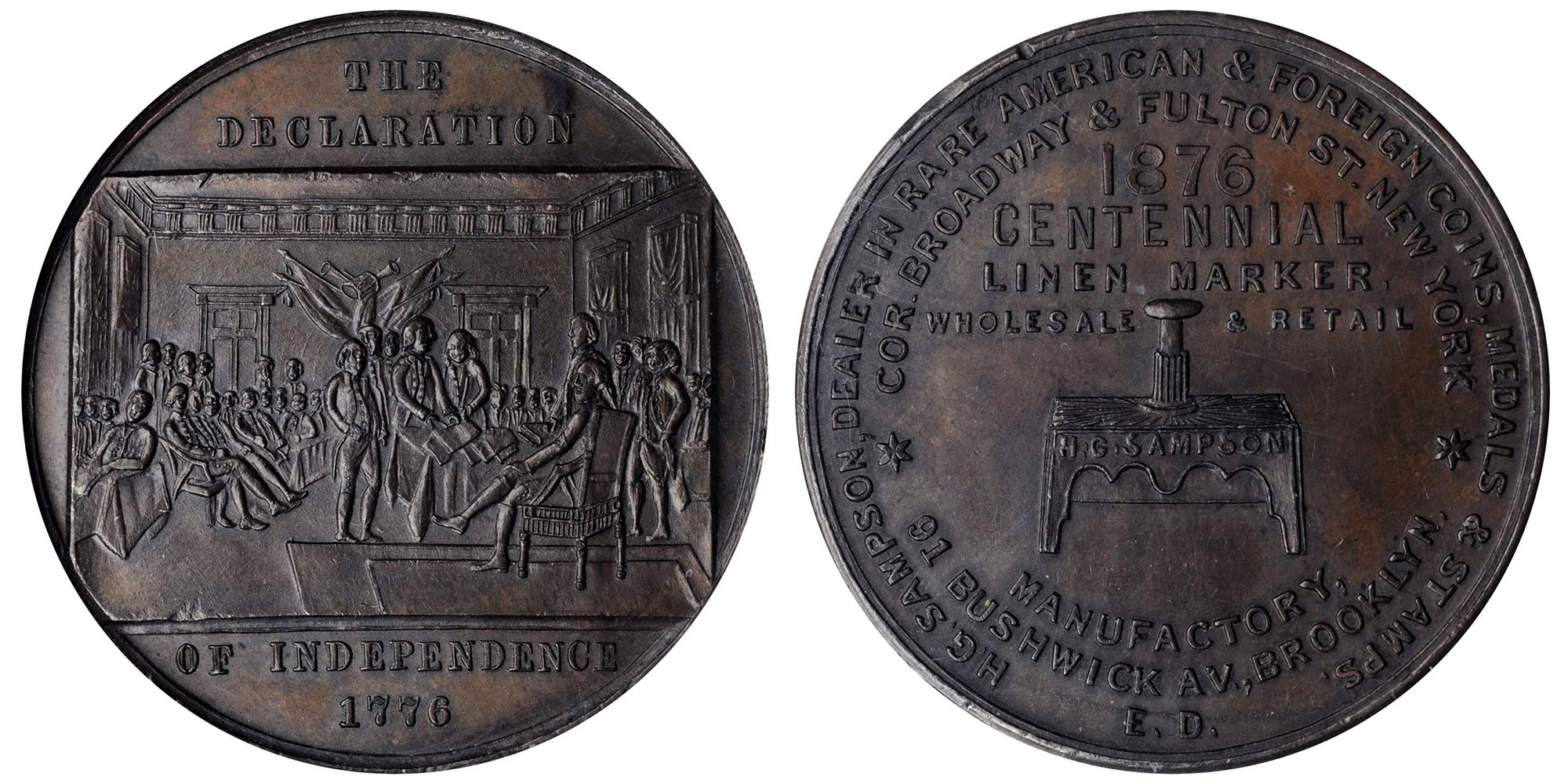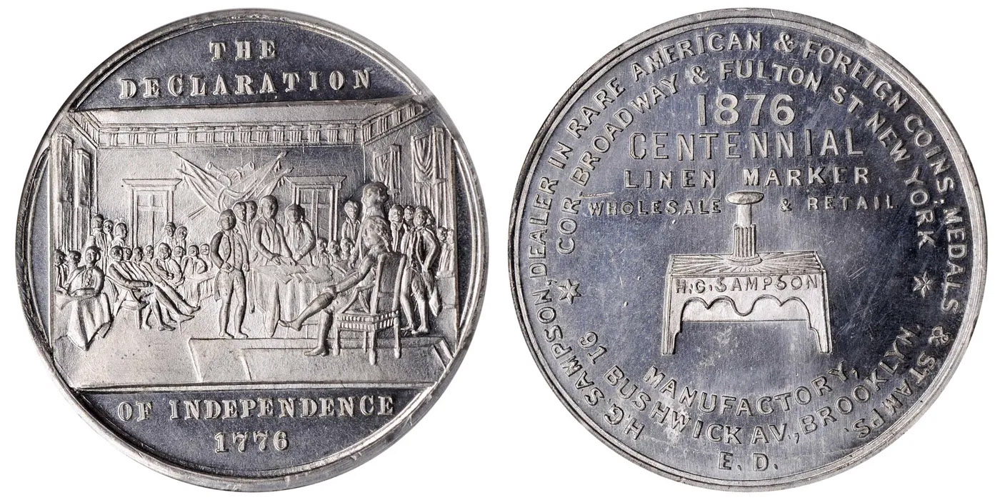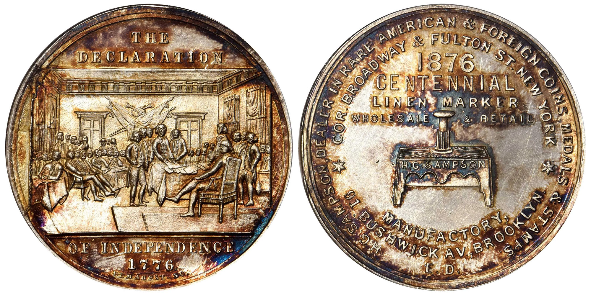 Here’s an example discussion. The following two medals are H.G. Sampson medals for the 1876 Centennial, sharing dies with HK-75–79. The bronzed white metal version isn’t listed in Rulau. What’s interesting is that the 3rd photo shows a silver one which uses a different So-Called Dollar die, the one with die sinker Abraham Demarest’s name on it, and that all 3 Declaration of Independence dies are different, which we examined and debated live.